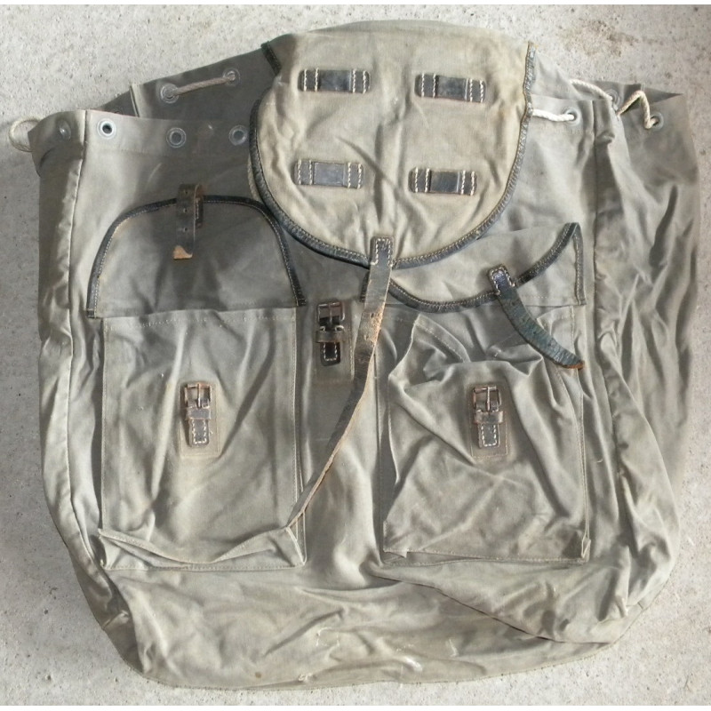 Le rare sac GJ avec renfort bois et toile en triangle au dos, Gros tampons des Gebirgsjäger "LPN" "F42" fabrikat 1942 Dépot de Münich. Le nom du soldat est très souvent écrit dedans.